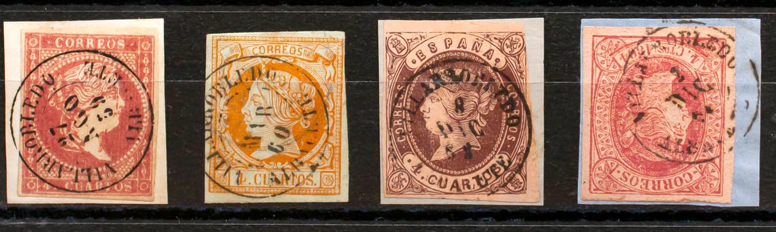 48, 52, 58, 64. (1855ca). Set of four 4- cuartos red, yellow, brown and pink stamps, unused with the VILLARROBLEDO / ALBACETE postmark. MAGNIFICENT.