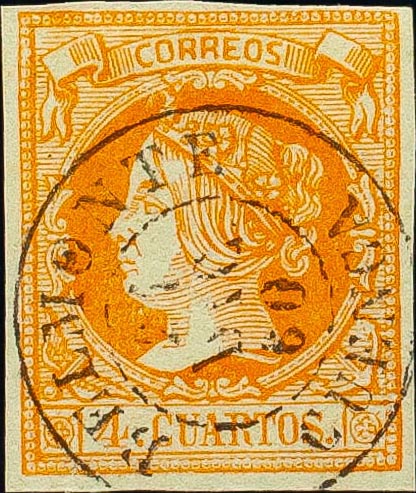 English 52. 1860. 4 cuartos yellow. Postmark BELMONTE / CUENCA. MAGNIFICENT.