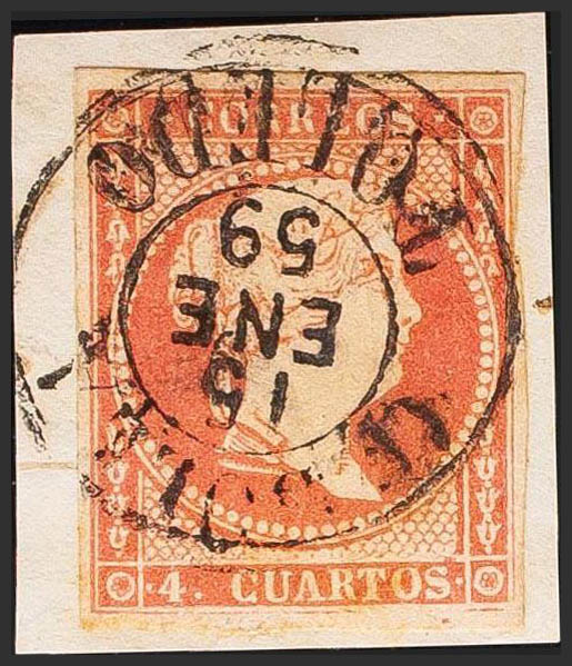 △ 48. 1855. 4 red cuartos , on fragment. ONION / TOLEDO postmark (Type I). MAGNIFICENT AND RARE.