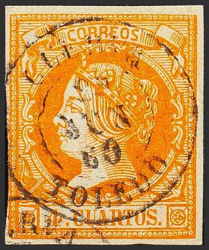 52. 1860. 4 cuartos yellow. CUERVA / TOLEDO postmark. MAGNIFICENT AND RARE.