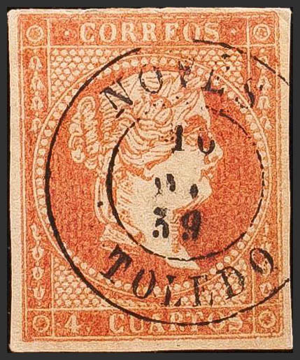 48. 1855. 4 cuartos red. Postmark NOVES / TOLEDO. MAGNIFICENT AND RARE.