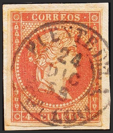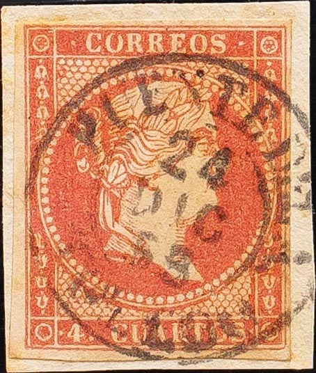 △ 48. 1855. 4 red cuartos , on fragment. Postmark PUENTE DEL A. / TOLEDO (Type I). MAGNIFICENT AND RARE.