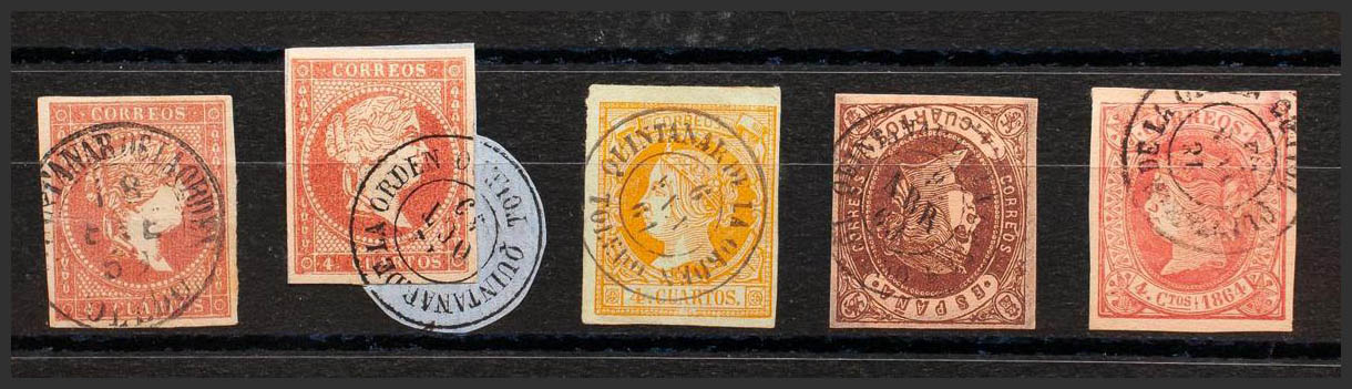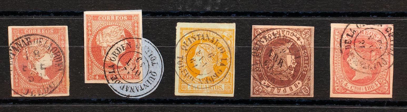 48(2), 52, 58, 64. (1855ca). Set of five 4- cuartos red, yellow, brown and pink stamps, unused with the QUINTANAR DE LA ORDEN / TOLEDO postmark (including Type I on the 4- cuartos red). MAGNIFICENT.
