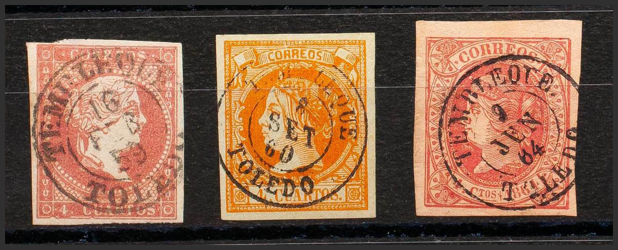 English 48, 52, 64. (1855ca). Set of three 4- cuartos red, yellow and pink stamps, unused with the TEMBLEQUE / TOLEDO postmark (Type I in the 4- cuartos red). MAGNIFICENT.