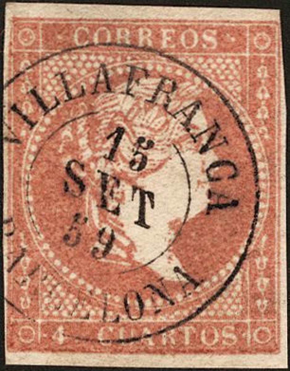 48. 1856. 4 red cuartos . Postmark VILLAFRANCA / BARCELONA. MAGNIFICENT.
