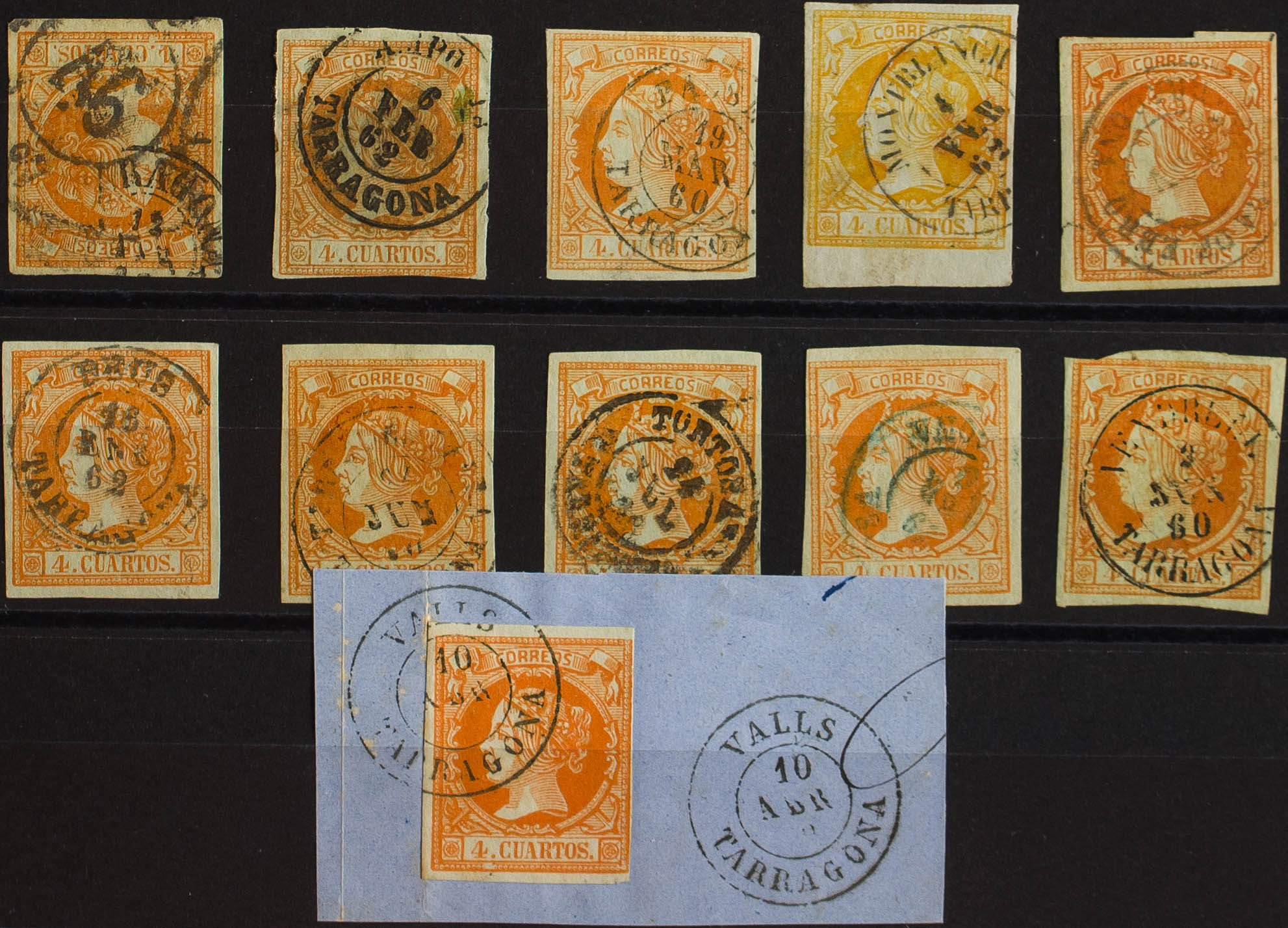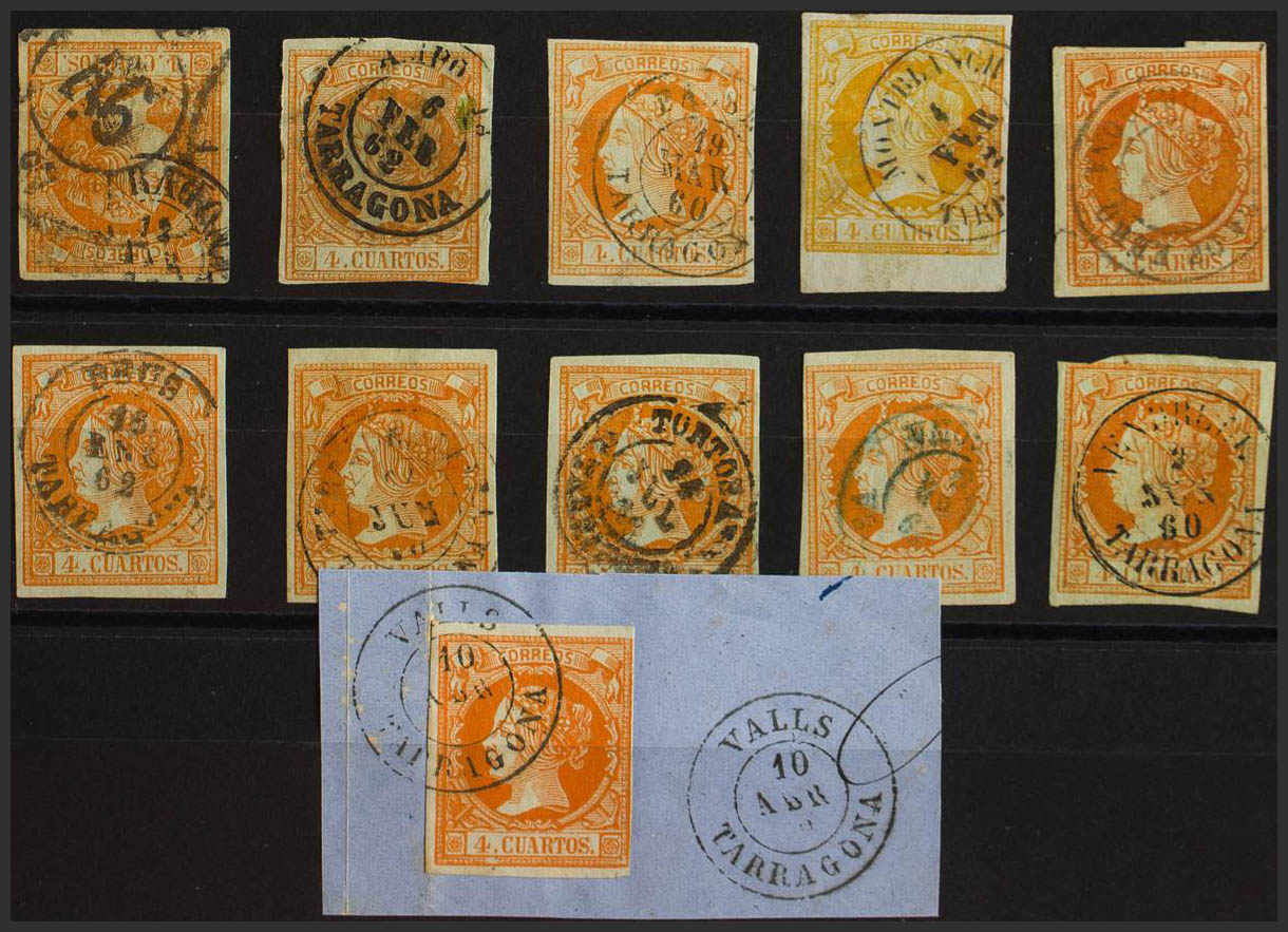 52(11). 1860. Set of eleven unused yellow 4- cuartos stamps with the daters of the province of Tarragona: Mixed TARRAGONA and R.CARRETA Nº46, AMPOSTA, FALSET, MONTBLANCH, MORA DE EBRO, REUS, TORREDEMBARRA, TORTOSA (in black and blue), VALLS and VENDRELL. MAGNIFICENT.
