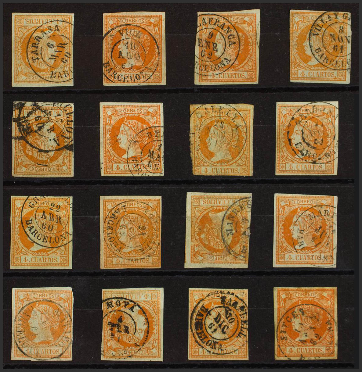 52(16). 1860. Set of sixteen unused yellow 4- cuartos stamps with date stamps from the province of Barcelona: Mixed BARCELONA and R. CARRETA Nº2, BERGA, CALELLA, CARDONA, GRANOLLERS, YGUALADA, MANRESA, MARTORELL, MATARO, MOYA, SABADELL, SITGES, TARRASA, VICH, VILLAFRANCA and VILANOVA AND GELTRU. MAGNIFICENT.