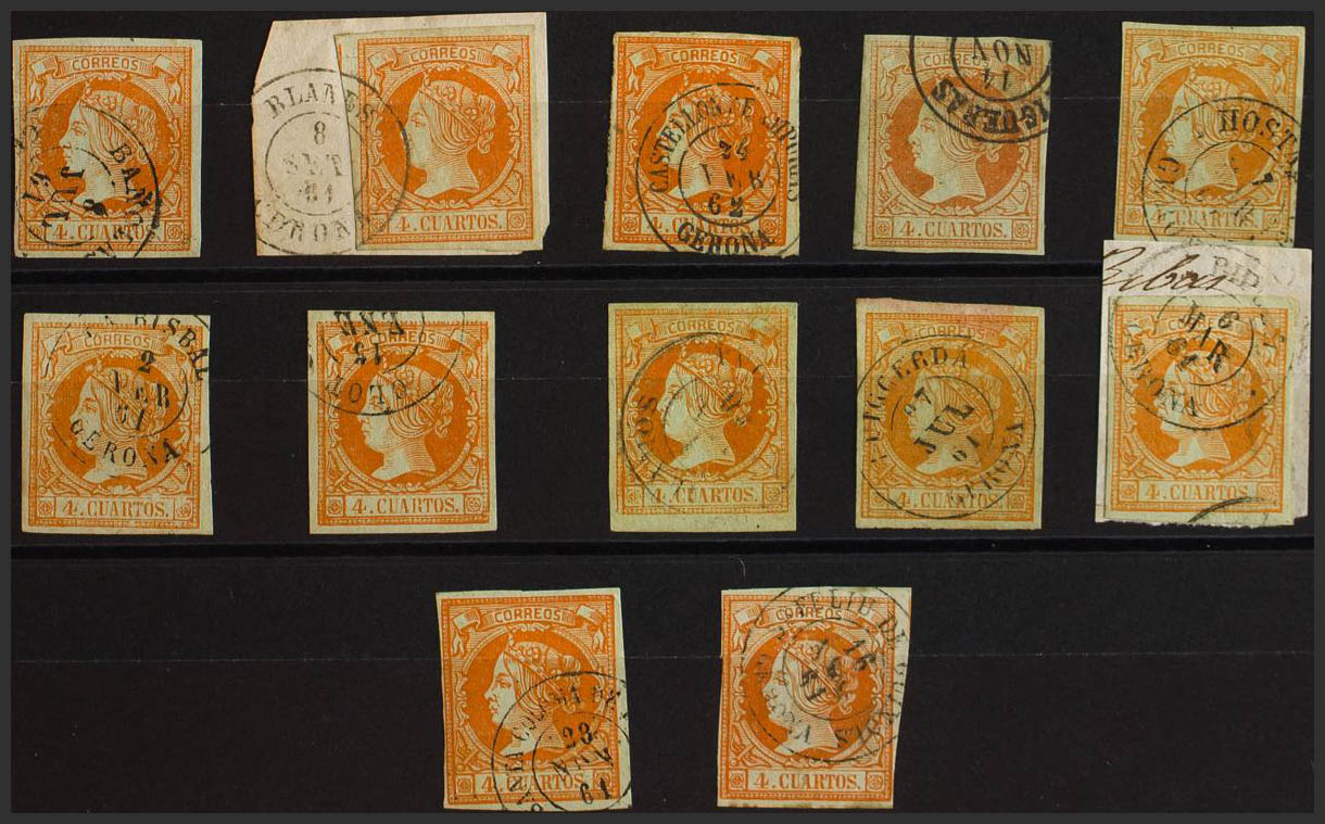 52(12). 1860. Set of twelve unused yellow 4- cuartos stamps with dates from the province of Gerona: BAÑOLAS, BLANES, CASTELLON DE AMPURIAS, FIGUERAS, HOSTALRICH, LA BISBAL, OLOT, PALAMOS, PUIGCERDA, RIPOLL, SANTA COLOMA DE FRANES and SAN FELIU OF GUIXOLS. MAGNIFICENT.