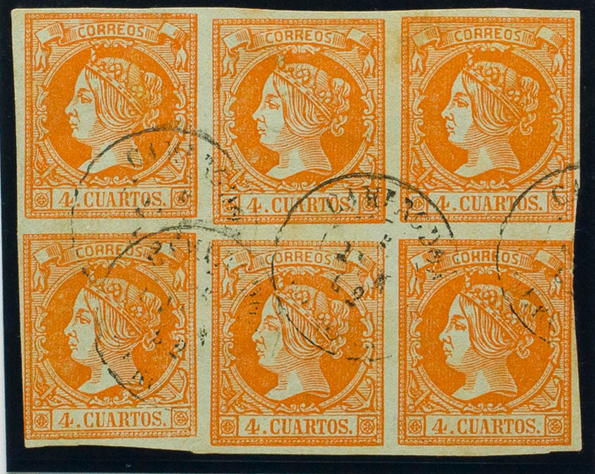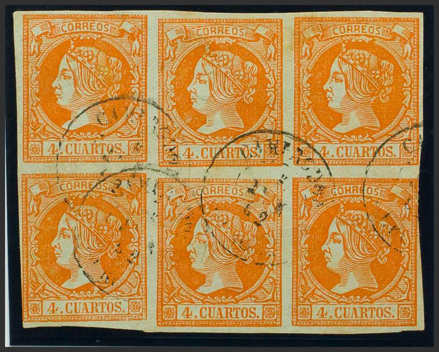 English 52(6). 1860. 4 orange cuartos , block of six. Postmark CAMPRODON / GERONA. MAGNIFICENT AND RARE.