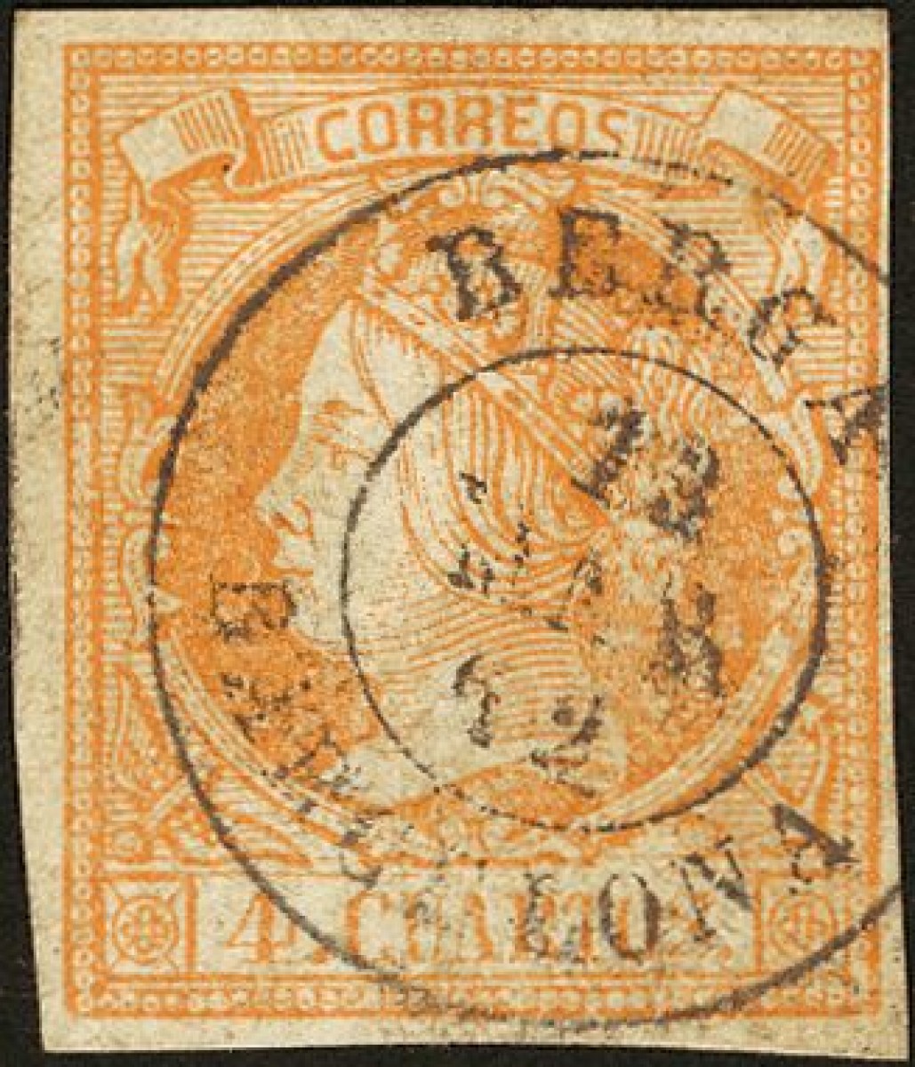 52. 1860. 4 cuartos yellow. Postmark BERGA / BARCELONA.