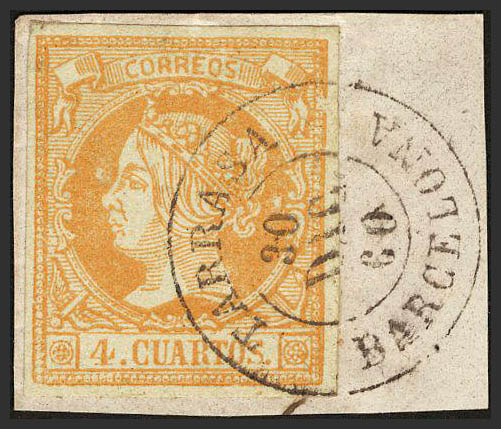 △ 52. 1860. 4 yellow cuartos , on fragment. Postmark TARRASA / BARCELONA. MAGNIFICENT.
