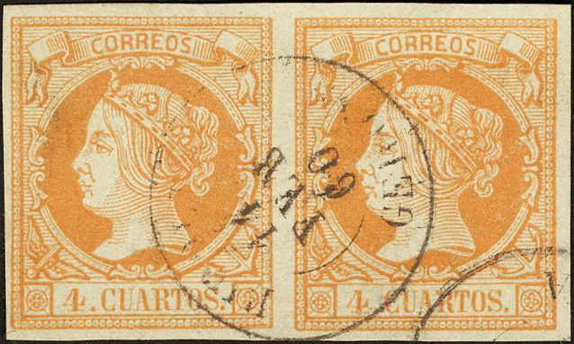 English 52(2). 1860. 4 cuartos yellow, pair. Postmark RIPOLL / GERONA. BARELY READABLE.