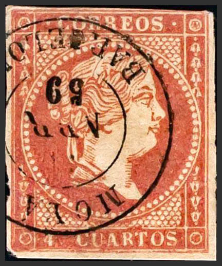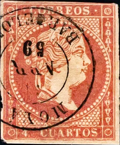 48. 1855. 4 cuartos red. Postmark MOYA / BARCELONA. MAGNIFICENT AND RARE.