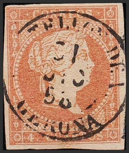 48. 1855. 4 cuartos red. Postmark CASTELLON DE A. / GERONA (Type I). BEAUTIFUL AND VERY RARE.