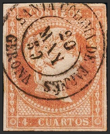 48. 1855. 4 cuartos red. Postmark SANTA COLOMA DE FARNES / GERONA. MAGNIFICENT AND RARE.