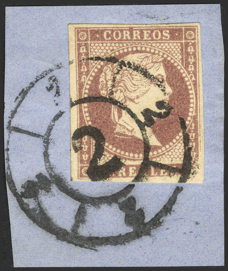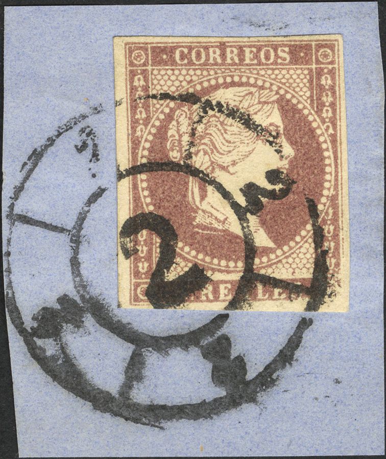 English △ 50. 1856. 2 reales purple, on fragment. Postmark R. CARRETA Nº2. MAGNIFICENT. Edifil 2010: 32.5 Euros