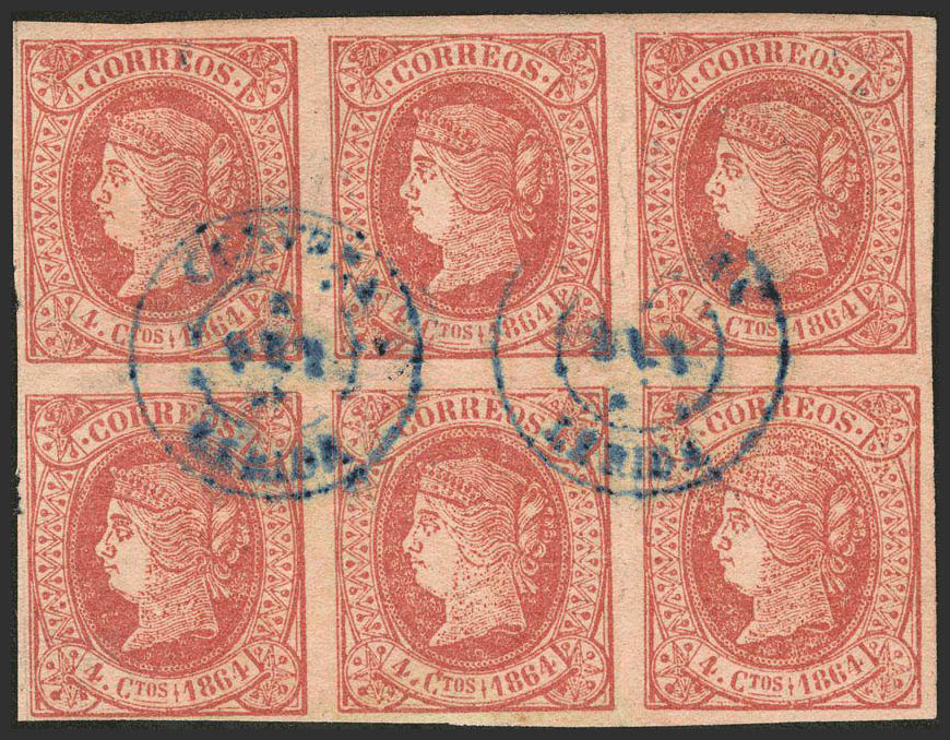 English 64(6). 1864. 4 red cuartos , block of six. Postmark CERVERA / LERIDA, in blue. MAGNIFICENT AND RARE.