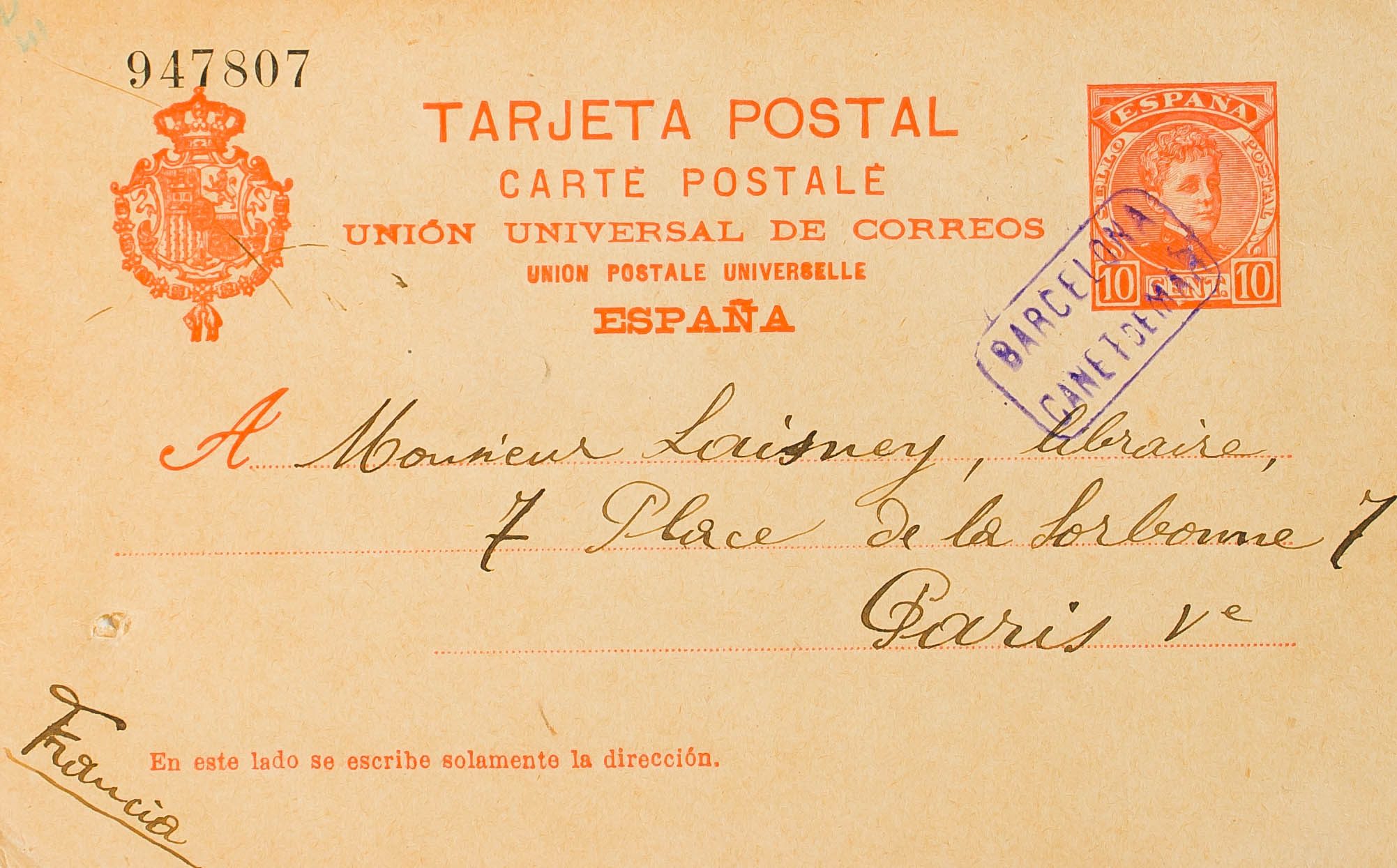 EP42. 1903. 10 cts orange envelope Postcard from CANET DEL MAR to PARIS. Mail postmark BARCELONA / CANET DEL MAR, in violet. MAGNIFICENT.