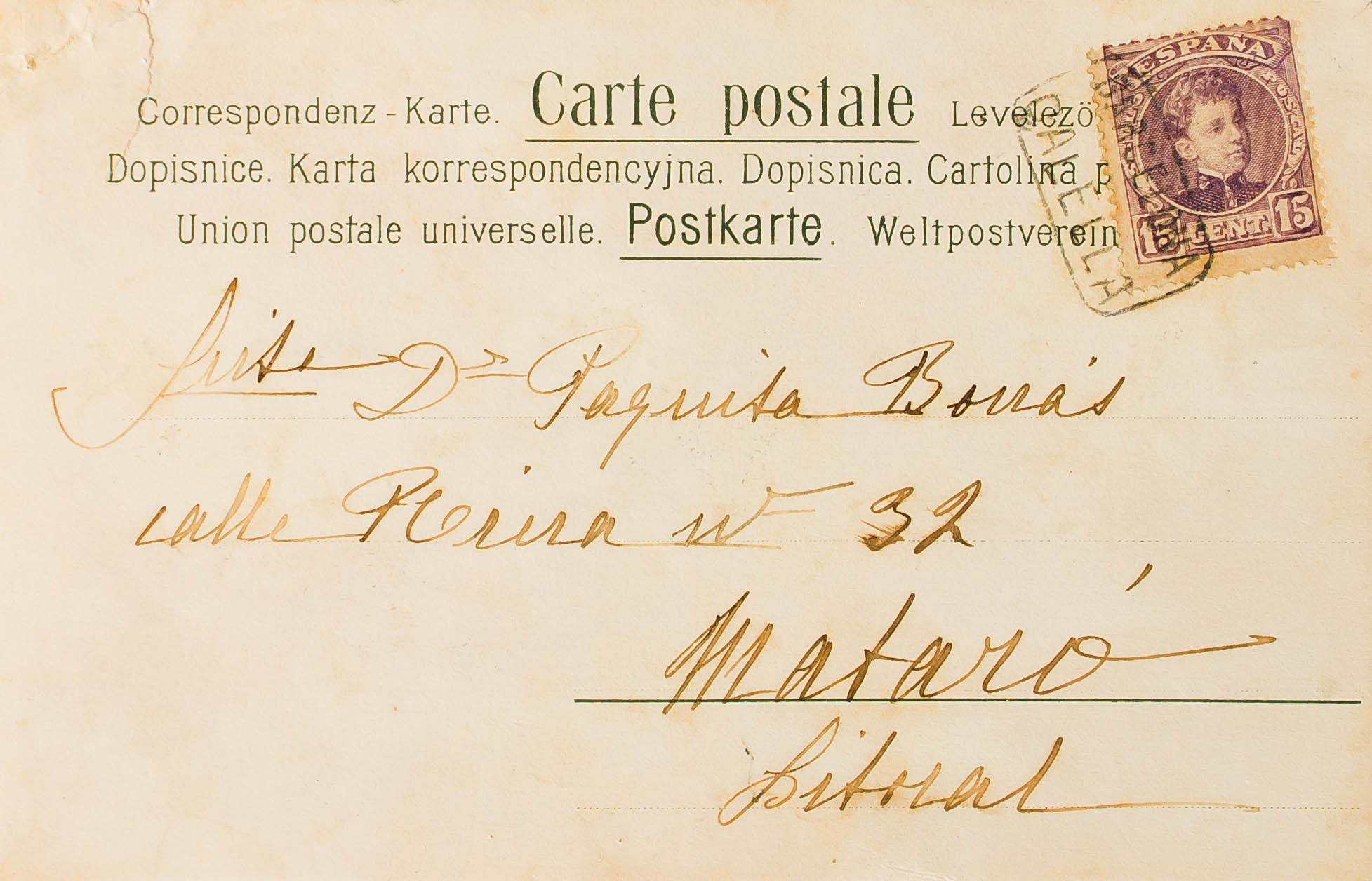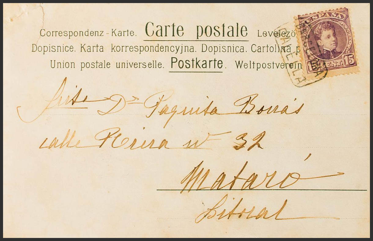 245. (1901ca). 15 cts lilac chestnut. CALELLA to MATARO. Mail postmark BARCELONA / CALELLA. MAGNIFICENT.