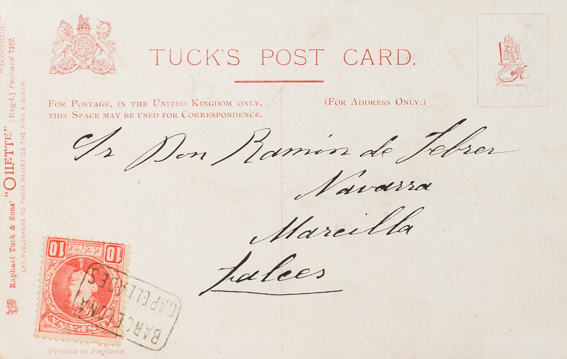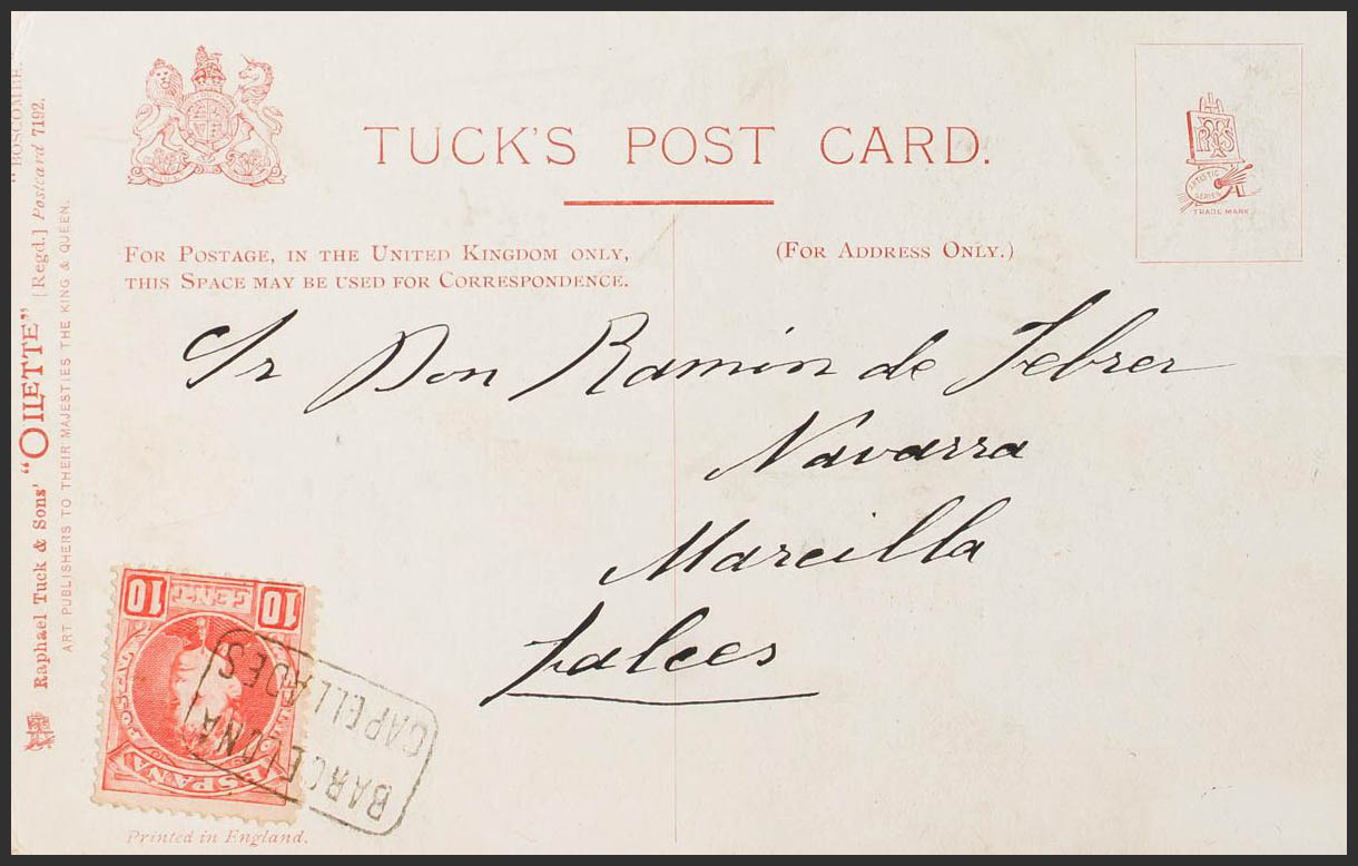 243. (1909ca). 10 ct red. CAPELLADES to FALCES. Mail postmark BARCELONA / CAPELLADES. MAGNIFICENT.