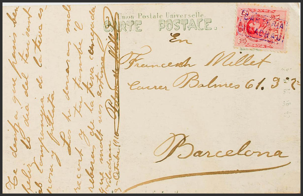269. 1910. 10 cts red. Postcard from VILADRAU (GERONA) to BARCELONA. Postmark CARTERIA / VILADRAU, in violet. MAGNIFICENT AND RARE.