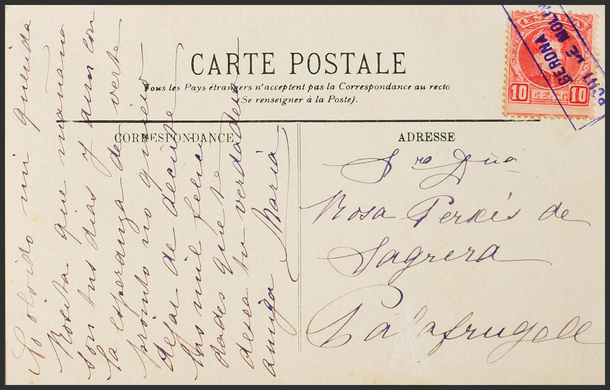 243. (1901ca). 10 ct red. Postcard from PONT DE MOLINS to PALAFRUGELL. Special postmark GERONA / PONT DE MOLINS, in blue. MAGNIFICENT AND VERY RARE.