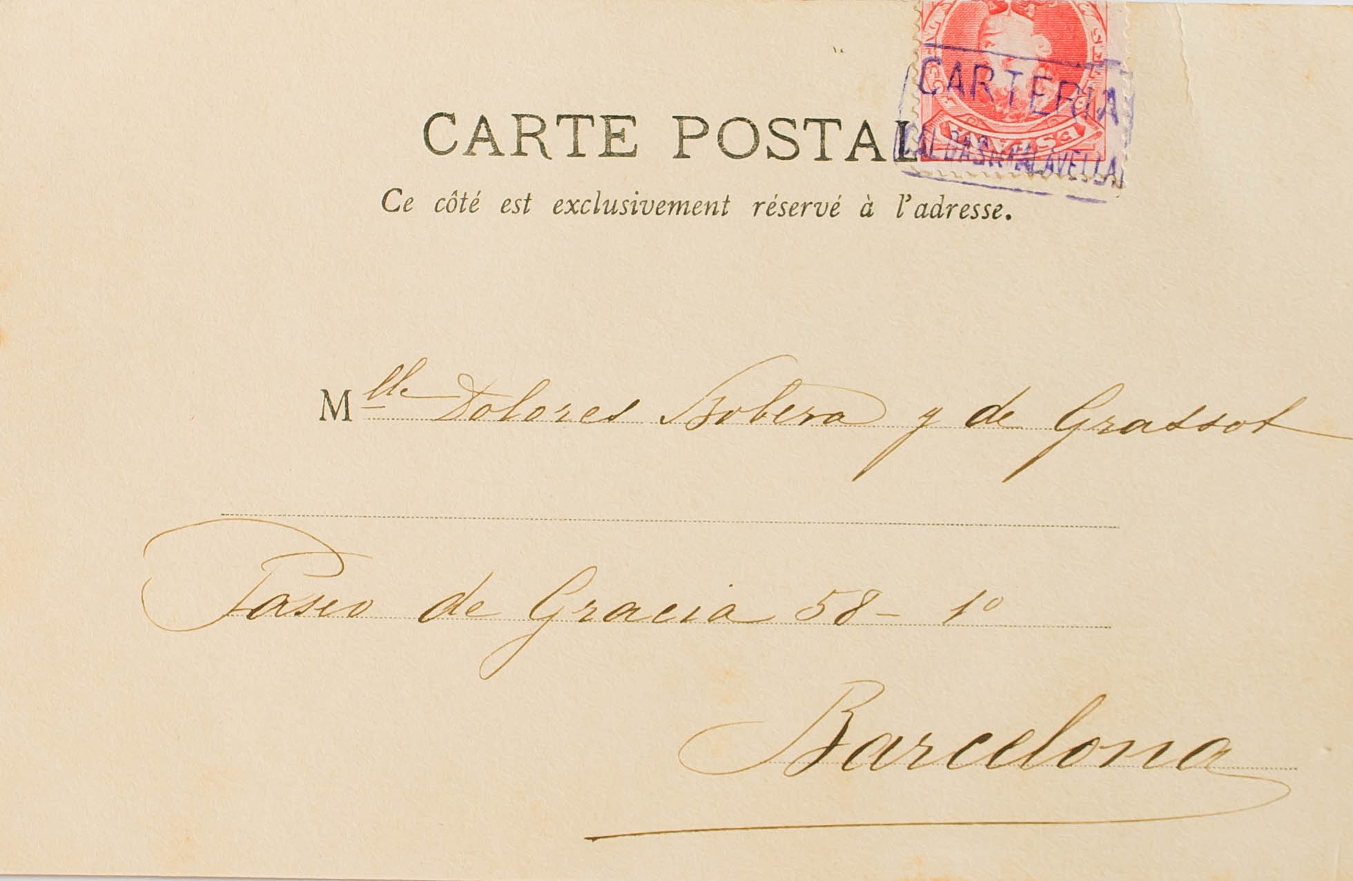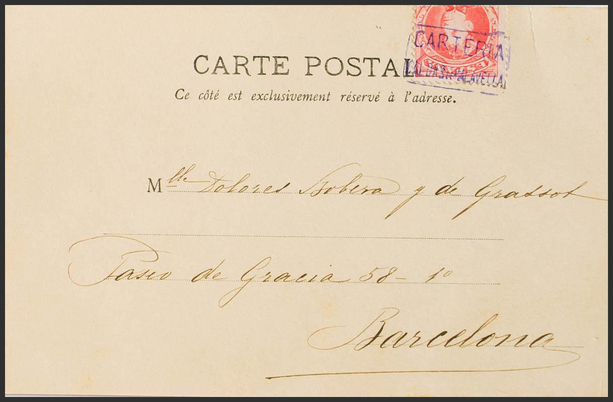 243. 1904. 10 cts red (seal also attached to the back and preserved in its entirety). Postcard from CALDAS DE MALAVELLA (GERONA) to BARCELONA. Postmark CARTERIA / CALDAS DE MALAVELLA, in blue. MAGNIFICENT.