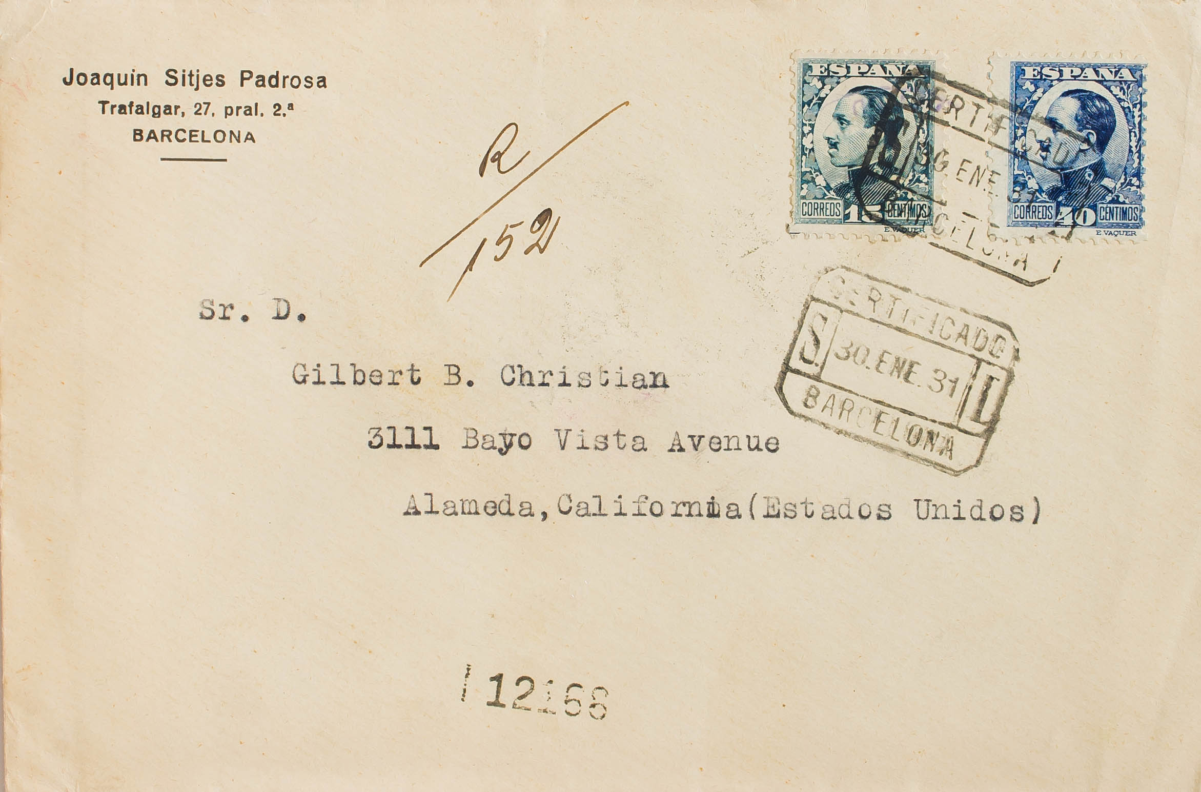 493, 497. 1931. 15 cts dark green and 40 cts blue. Certificate from BARCELONA to ALAMEDA (USA). On the back arrival. MAGNIFICENT.