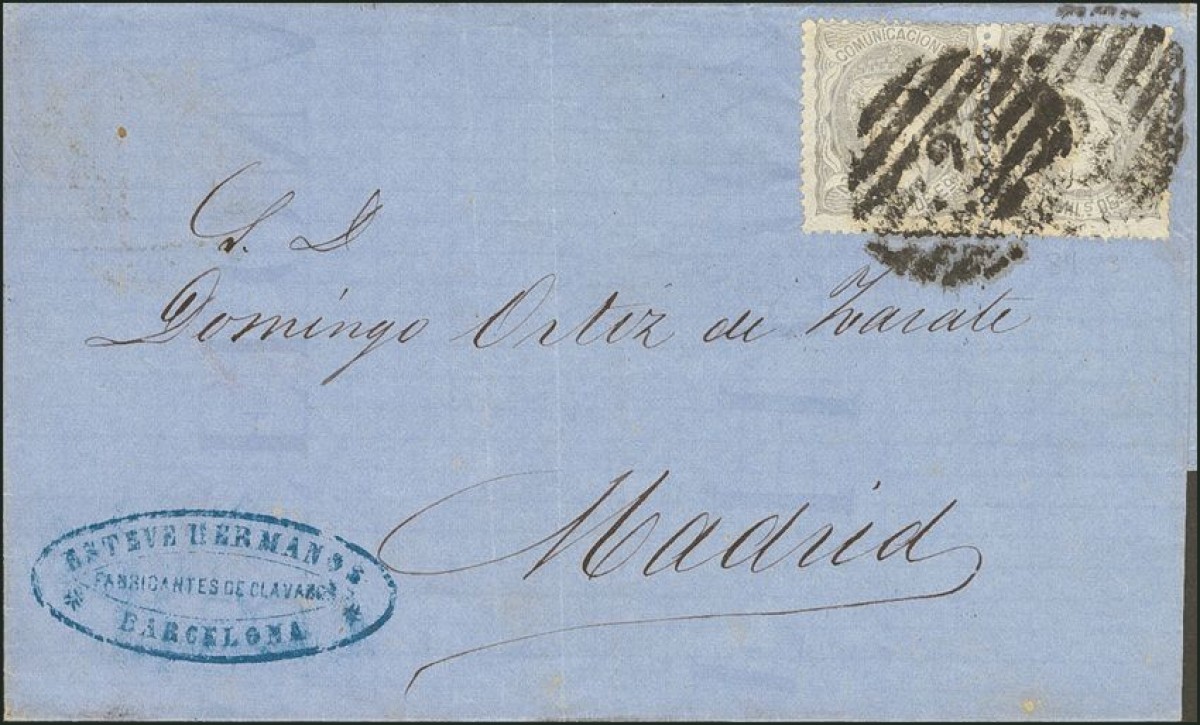 106(2). 1870. 25 thousand. lilac, couple BARCELONA to MADRID. Postmark GRILL Nº2. RARE COMBINATION TO FORM THE RATE OF 50 THOUSAND.