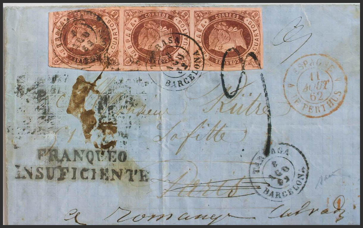 58(3). 1862. 4 chestnut cuartos , strip of three. TARRASA to PARIS, and forwarded to ROMANG. On the front it marks POSTAGE / INSUFFICIENT and appraised with "9" tenths, by French mail. MAGNIFICENT AND UNUSUAL.