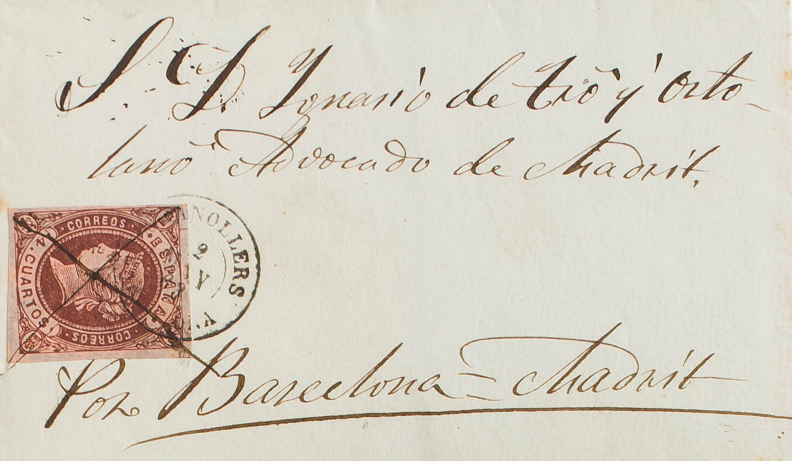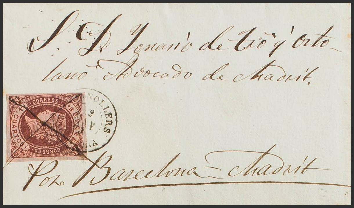58. 1863. 4- cuartos chestnut. GRANOLLERS to MADRID. Mixed "Cruz de Tinta" postmark and GRANOLLERS / GERONA dater. MAGNIFICENT AND UNUSUAL.