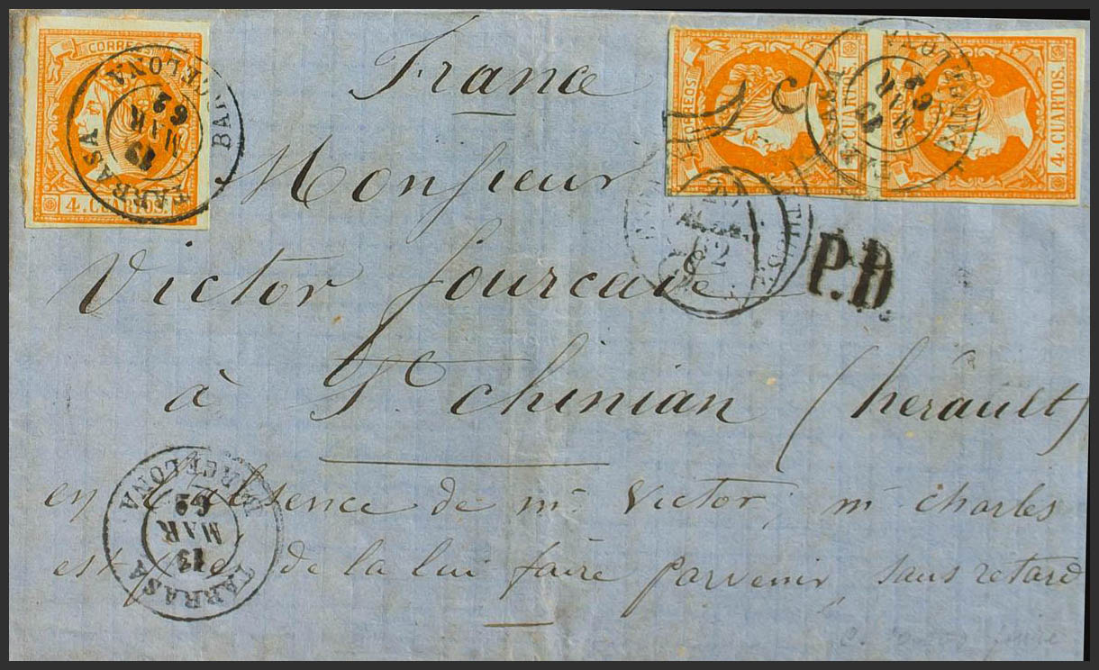 52(3). 1862. 4 yellow cuartos , a pair and a seal. TARRASA to HERAULT (FRANCE). MAGNIFICENT AND SPECTACULAR COMBINATION OF 12 ROOMS TO FRANCE.
