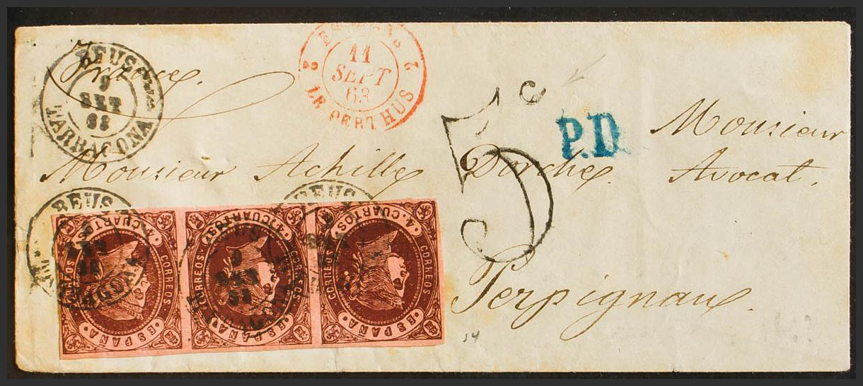 58(3). 1863. 4 chestnut cuartos , strip of three. REUS to PERPIGNAN (FRANCE). Postmark REUS / TARRAGONA. MAGNIFICENT AND UNUSUAL COMBINATION OF POSTAGE TO COMPLETE THE RATE TO FRANCE OF 12 QUARTERS.