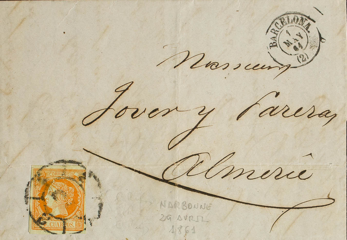 52. 1861. 4 orange cuartos . NARBONA (FRANCE) to ALMERIA, privately routed to Barcelona. It is deposited in the mail adding the corresponding stamp so that it continues with its route. MAGNIFICENT AND VERY RARE.
