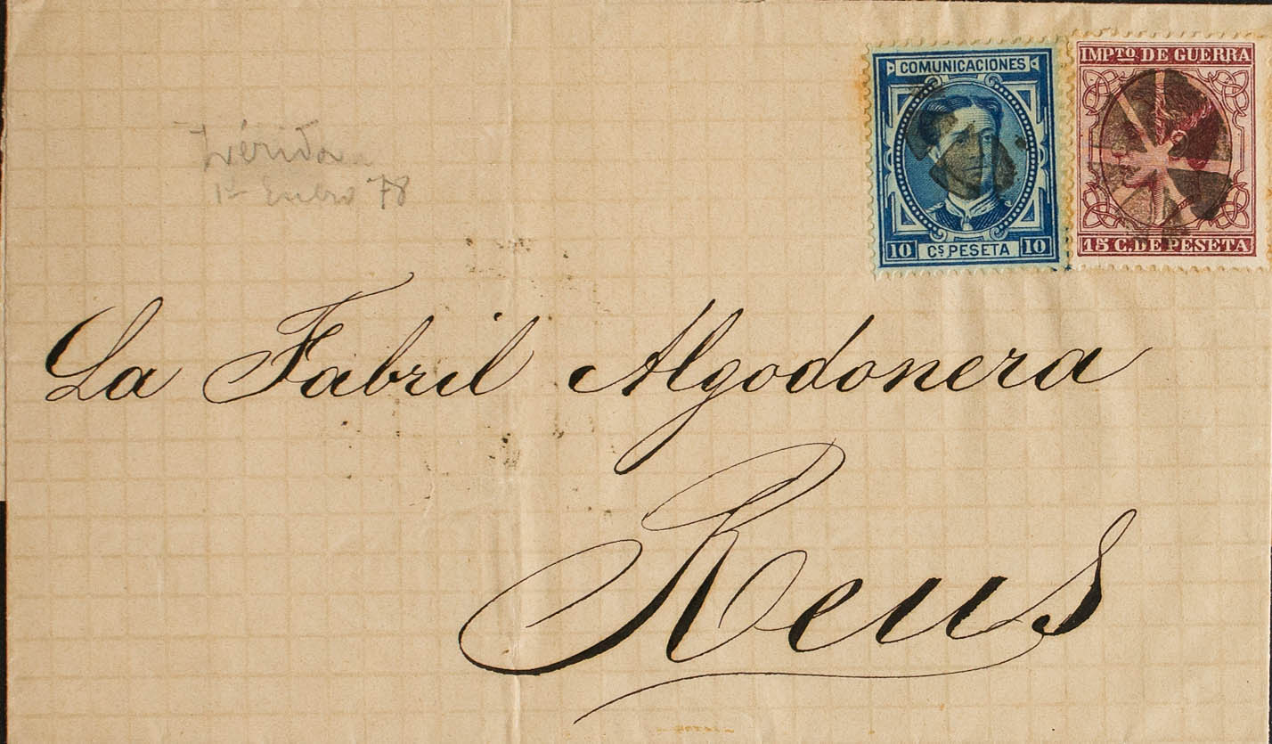 175, 188. 1878. 10 cts blue and 15 cts carmine. Addressed to REUS. Postmark CIRCLE OF EIGHT BLADES, applied upon arrival. MAGNIFICENT AND RARE.
