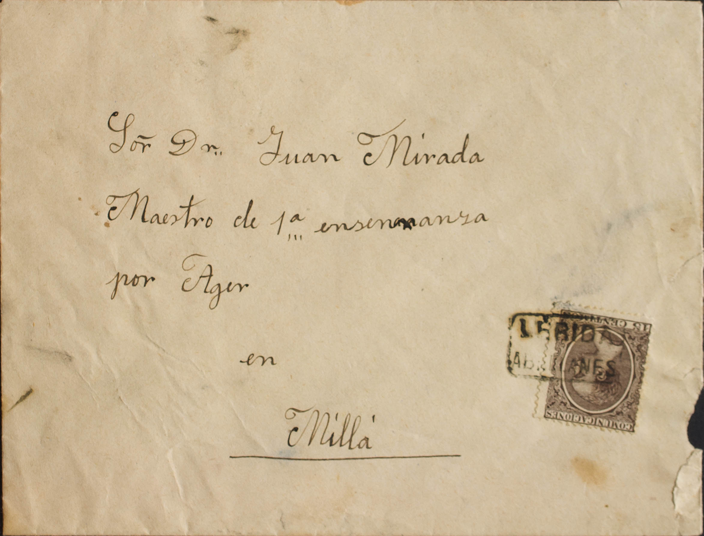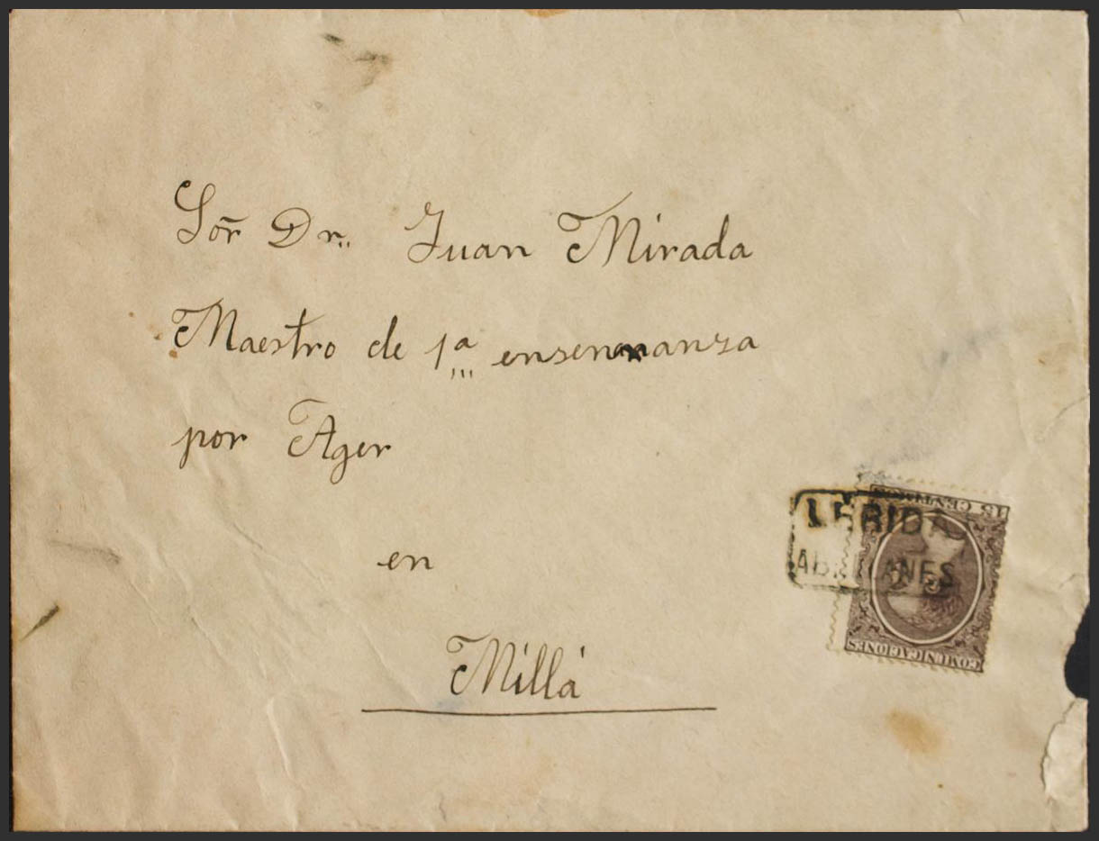 219. (1889ca). 15 chestnut cts. THEM COUNTERSUNK TO MILLA. Mail postmark LERIDA / ABELLANES. MAGNIFICENT AND RARE.
