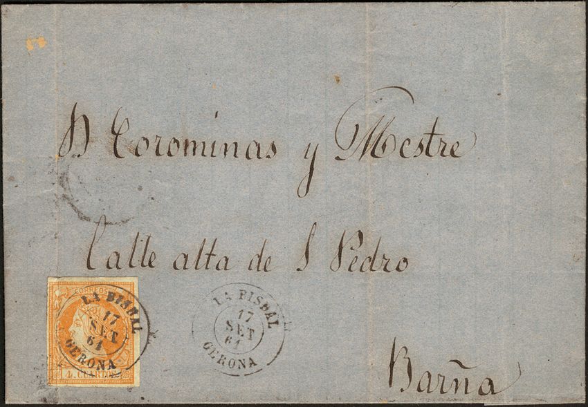 52. 1860. 4 cuartos yellow. LA BISBAL to BARCELONA. Postmark LA BISBAL / GERONA. File fold.
