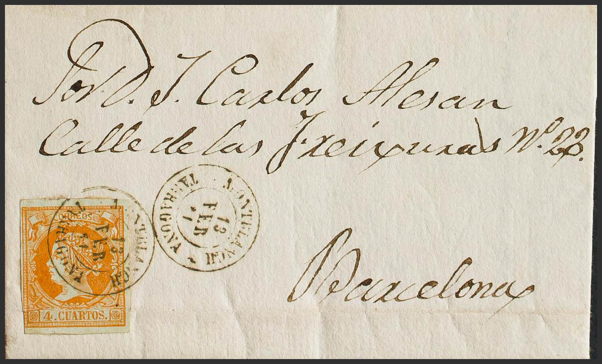 52. 1860. 4 cuartos yellow. MONTBLANCH to BARCELONA. Postmark MONTBLANCH / TARRAGONA. MAGNIFICENT.