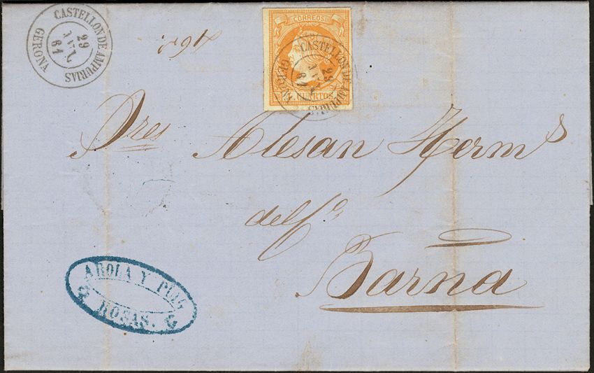 52. 1860. 4 cuartos yellow. CASTELLON DE AMPURIAS to BARCELONA. Postmark CASTELLON DE AMPURIAS / GERONA. MAGNIFICENT.
