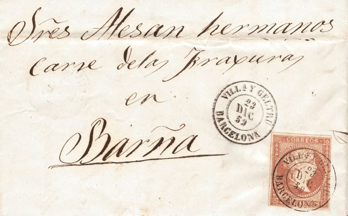 48. 1856. 4 red cuartos . VILLª AND GELTRU to BARCELONA. Postmark VILLª Y GELTRU / BARCELONA. MAGNIFICENT.