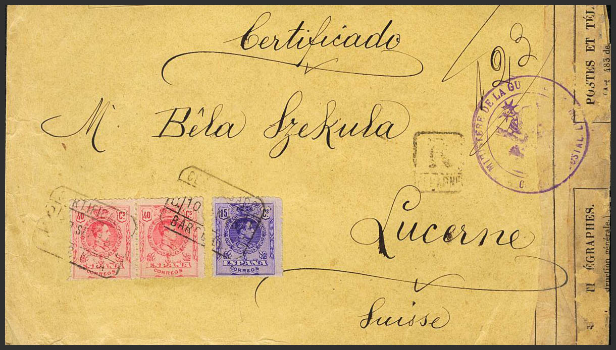 270, 276(2). 1915. 15 cts violet and 40 cts pink, two stamps. Certificate from BARCELONA to LUCERNA (SWITZERLAND). On the back arrival. MAGNIFICENT.