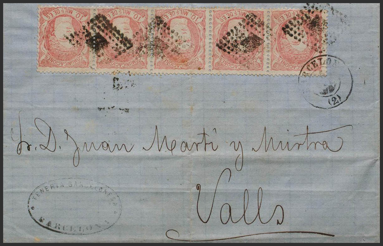 105(5). 1871. 10 mils pink, strip of five. BARCELONA to VALLS. MAGNIFICENT AND EXTREMELY RARE AND SPECTACULAR COMBINATION OF POSTAGE TO COMPLETE THE 50 MILS FEE, PROBABLY ONLY KNOWN.