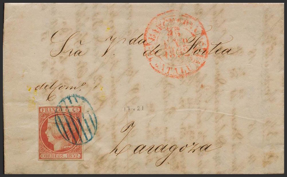 12. 1852. 6 cuartos pink. BARCELONA to ZARAGOZA. Postmark GRILL, in blue. MAGNIFICENT.