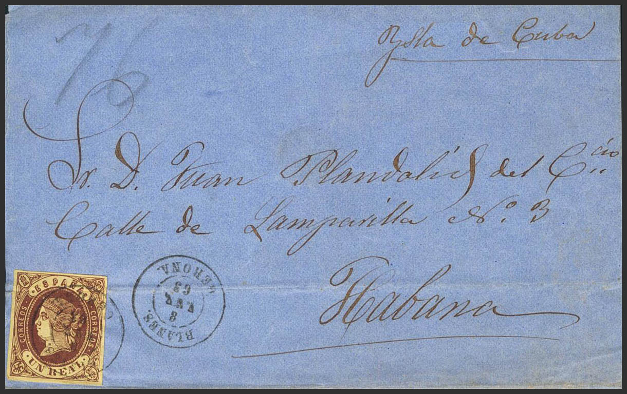 61. 1863. 1 real chestnut. BLANES to HAVANA (CUBA). Postmark BLANES / GERONA. MAGNIFICENT.