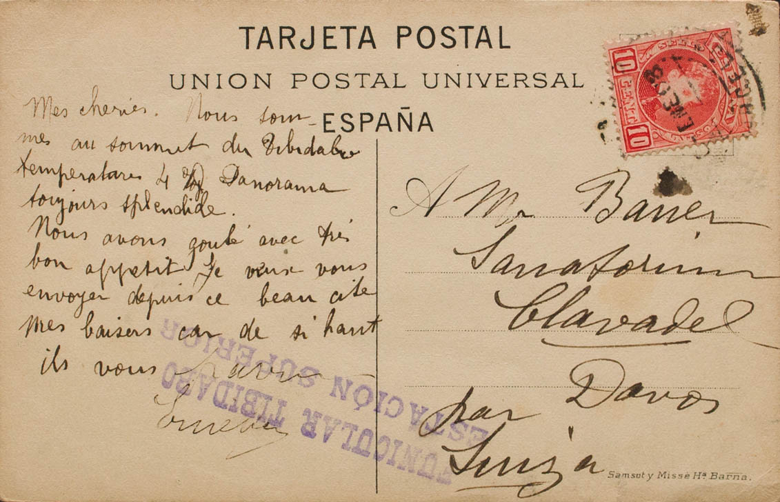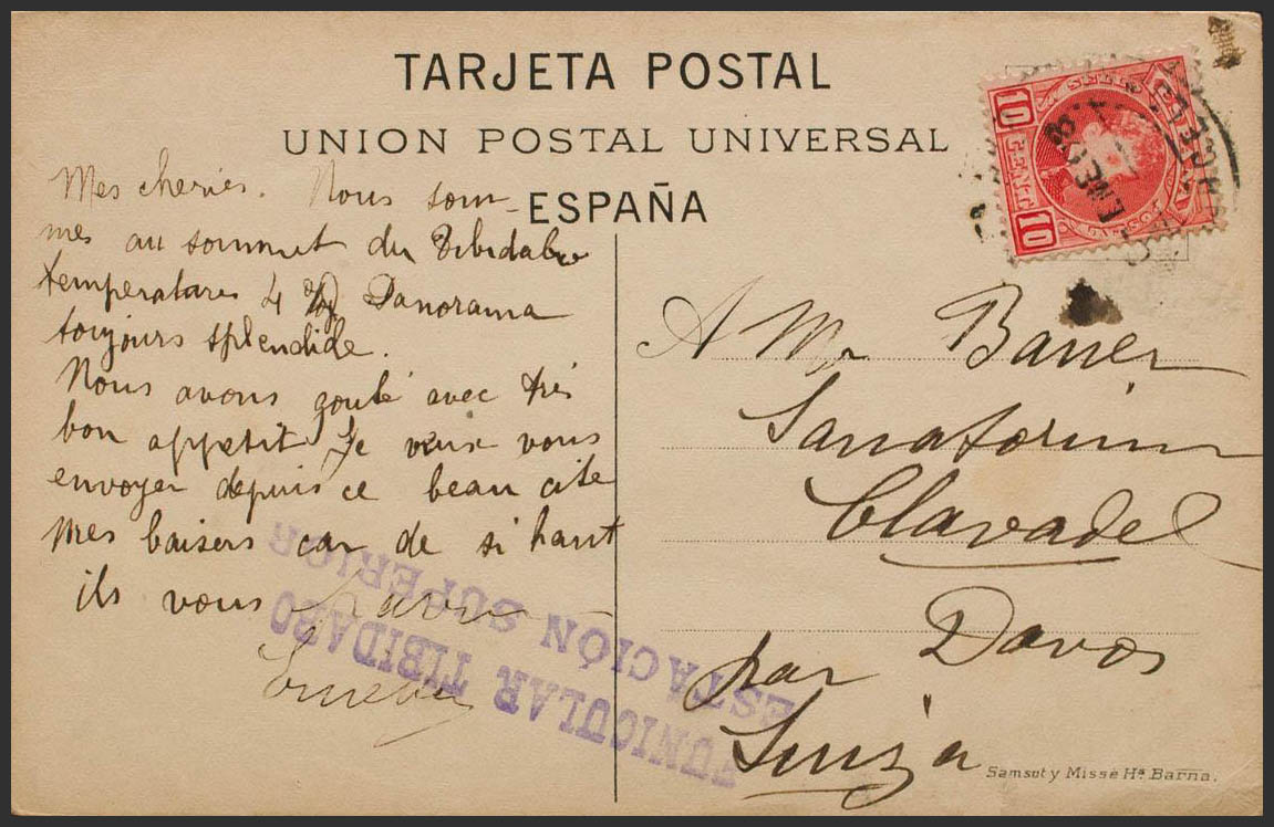 243. 1903. 10 cts red. Postcard from BARCELONA to DAVOS (SWITZERLAND). On the front mark FUNICULAR TIBIDABO / STATION SUPERIOR, in purple. MAGNIFICENT.