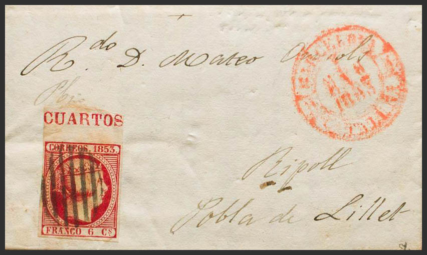 17. 1853. 6 rose cuartos , leaf edge with legend. BARCELONA to POBLA DE LILLET. MAGNIFICENT AND RARE, PIECE OF ENORMOUS SPECTACULARITY. Ex-Blight.