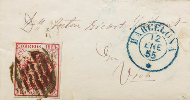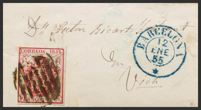 33. 1855. 4 carmine cuartos . BARCELONA to VICH (small format letter). MAGNIFICENT AND UNUSUAL. Ex-Blight.
