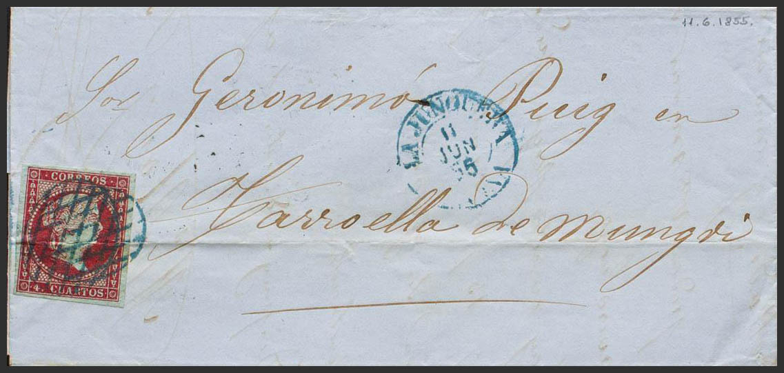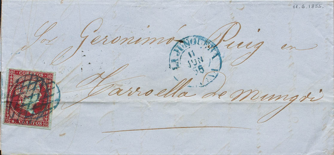 40. 1855. 4 red cuartos . THE PERTHUS (FRANCE) to TORROELLA DE MONTGRI (GERONA). GRILL postmark (two crossed), in blue. MAGNIFICENT AND RARE. Ex-Blight.