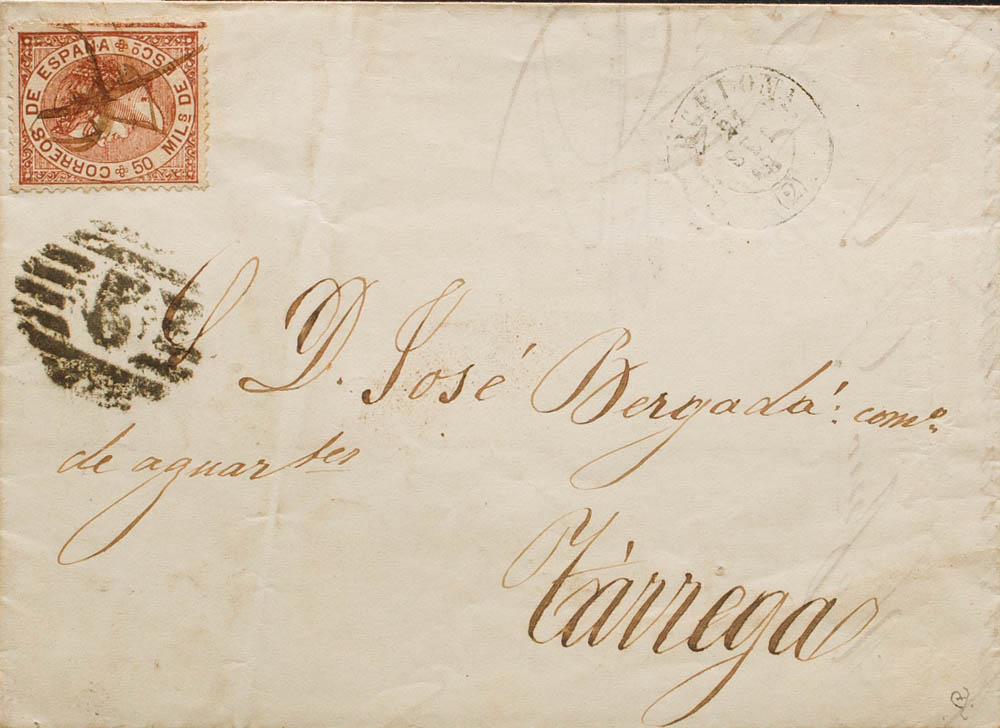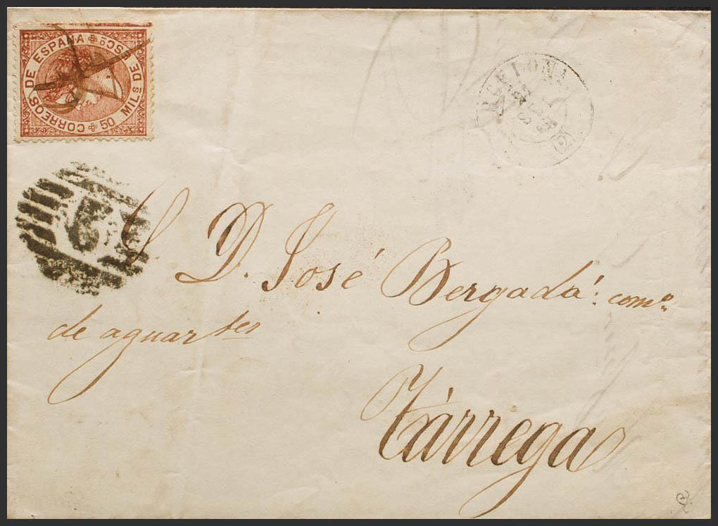 96. 1868. 50 mils yellow chestnut. BARCELONA to TARREGA. Incomprehensibly canceled by pen and next to it GRILL WITH Nº2. MAGNIFICENT. Ex-Blight.