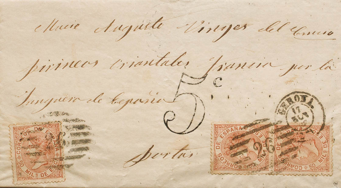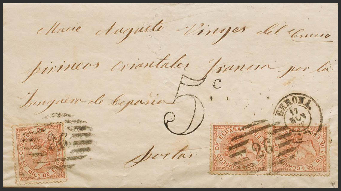 96(3). 1868. 50 chestnut cts, three stamps. GLASSES (GERONA) to EL PERTHUS (FRANCE). MAGNIFICENT AND UNUSUAL COMBINATION OF POSTAGE TO COMPLETE THE FEE OF 150 MILS TO FRANCE. Ex-Blight.